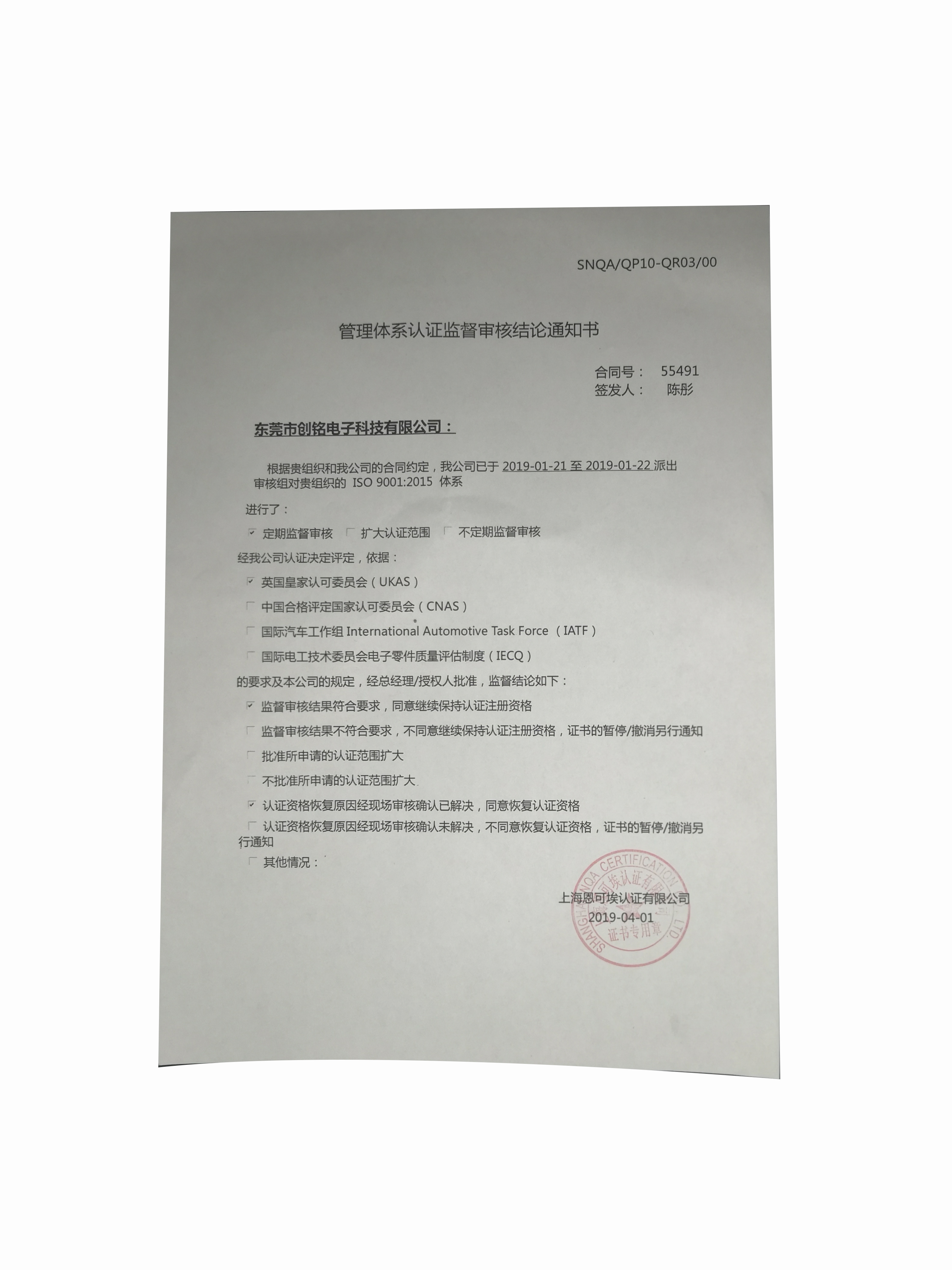 創(chuàng)銘電子2019年ISO:2015年審?fù)ㄖ獣?/dd>